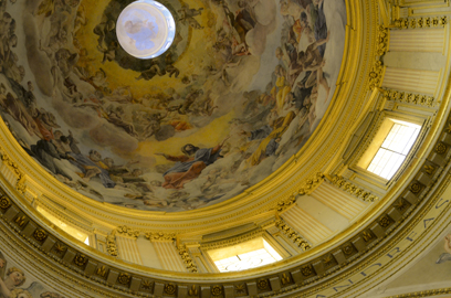 When I travel in Italy, I go into every church I see. Even the plainest country church can have beautiful candlesticks or serene madonnas or flying angels on the walls. But Rome, hands down, is the best for churches. The interiors are extraordinary and often Baroque. This is not a particularly famous church, but I loved the intricate plasterwork, the multitudinous cast of characters – human and divine, naked and clothed — swirling around the dome. It’s hard to see in this size of the photo, but at the very top, an angel or saint is looking down on us from heaven.