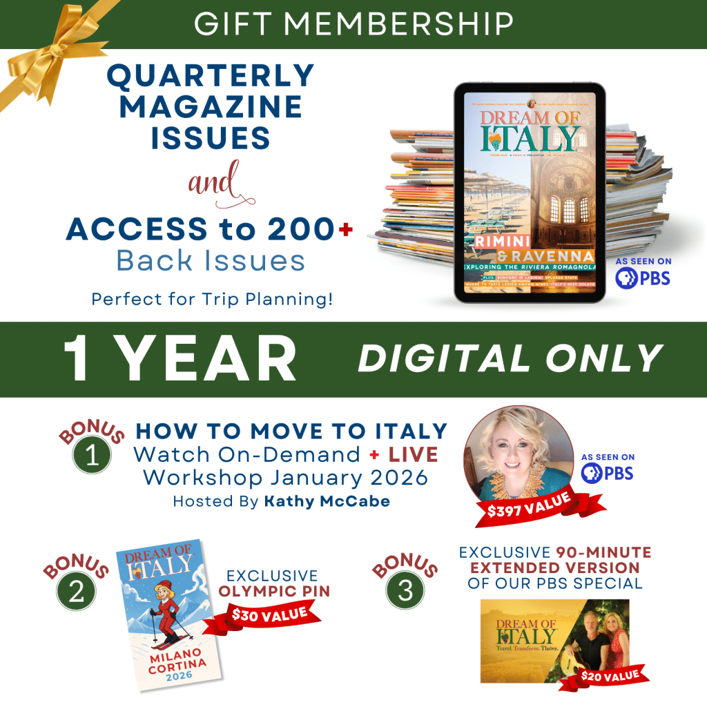Give the gift of Italy to your favorite Italophile for as little as $87 for a year and let them find out why USA TODAY, The New York Times, ABC NEWS and more have recommended Dream of Italy for the most savvy travel advice for visiting the land of la dolce vita. This is the award-winning magazine and travel membership website founded and still published by Italy travel expert Kathy McCabe and the inspiration for the hit PBS TV series Dream of ItalyIf you would prefer to order over the telephone, no problem, call us at 202-297-3708.