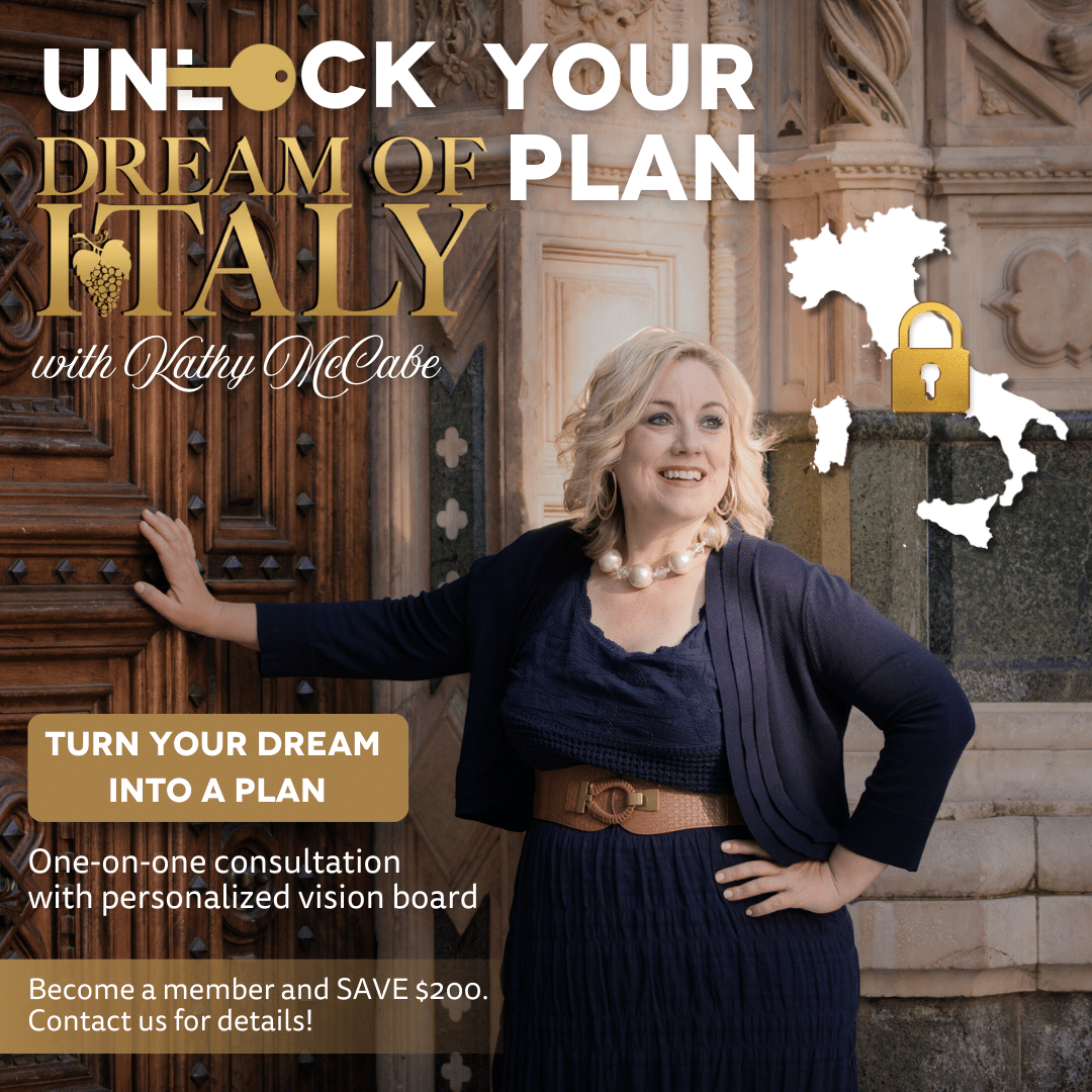 Who knows more about making Italian dreams come true than Kathy McCabe, host of Dream of Italy on PBS and founder of Dream of Italy. Whether your dream is a special trip to Italy or a move or real estate purchase, Kathy understands that every dream needs a plan and she will work one-on-one with you (or your gift recipient) to unlock your Dream of Italy Plan!
